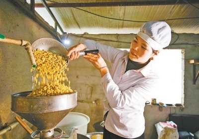 貴州省貴陽(yáng)市修文縣久長(zhǎng)鎮(zhèn)孟沖村一家豆腐加工作坊,工作人員將大豆舀入打漿機(jī)加工。周訓(xùn)超攝(人民視覺)