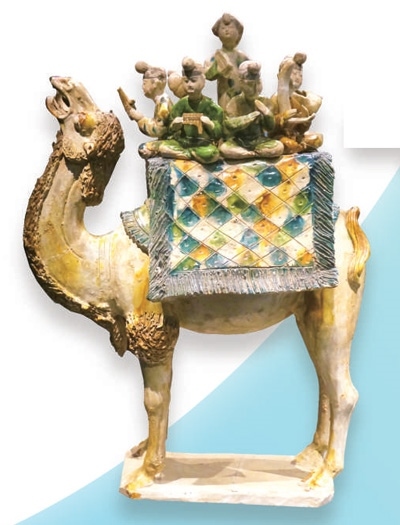 陜西歷史博物館藏三彩載樂駱駝俑,見證了文化藝術交融的歷史。一塊色彩斑斕的毛毯置于駝背之上,7名樂手手持不同樂器盤腿演奏,中間一女子正動情歌唱。一個“駝背上的樂隊”,再現(xiàn)了鮮活的盛唐長安,各地人們在此相遇,盡情演繹對美好生活的追求。