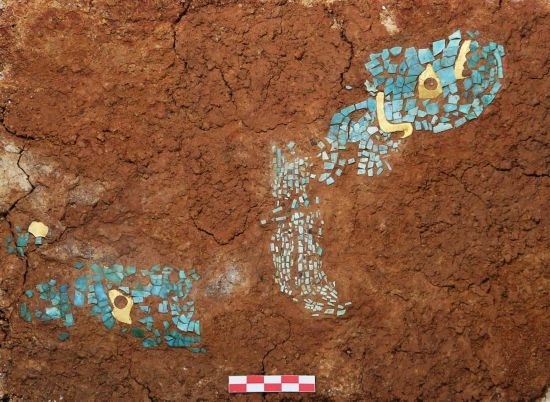 湖北黃陂盤龍城遺址楊家灣M17出土的金片綠松石鑲嵌飾。(全國十大考古新發(fā)現(xiàn)活動辦公室供圖)