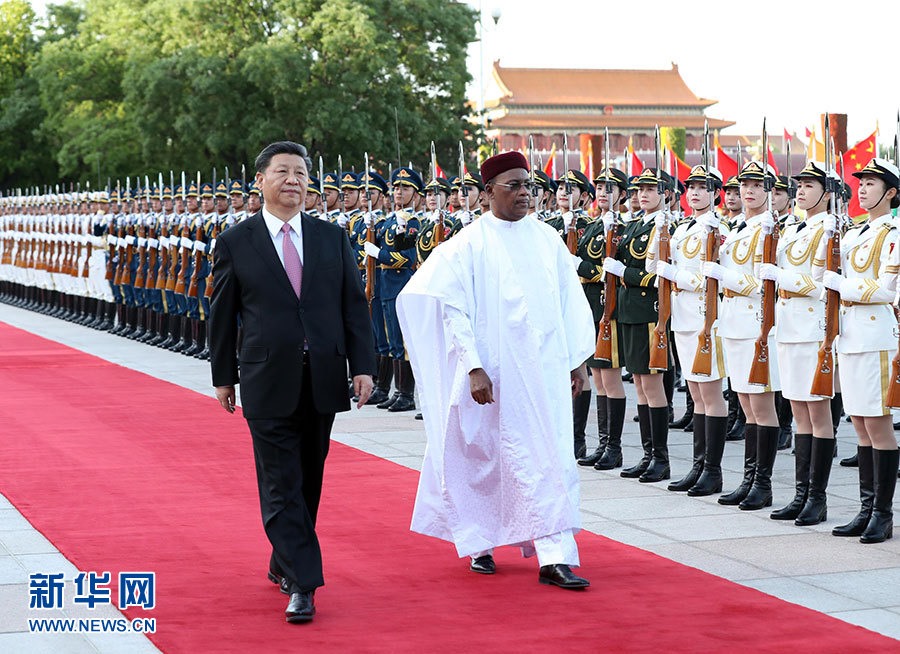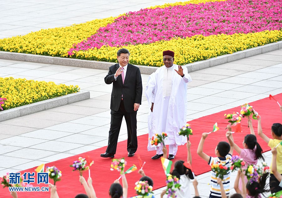 5月28日,國(guó)家主席習(xí)近平在北京人民大會(huì)堂同尼日爾總統(tǒng)伊素福舉行會(huì)談。這是會(huì)談前,習(xí)近平在人民大會(huì)堂東門(mén)外廣場(chǎng)為伊素福舉行歡迎儀式。