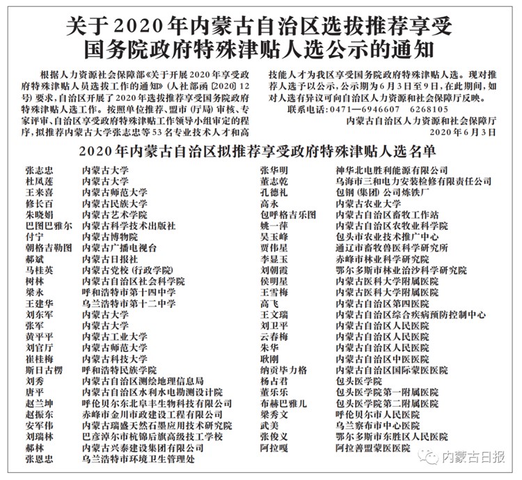 根據(jù)人力資源社會保障部《關于開展2020年享受政府特殊津貼人員選拔工作的通知》(人社部函〔2020〕12號)要求,自治區(qū)開展了2020年選拔推薦享受國務院政府特殊津貼人選工作。按照單位推薦、盟市(廳局)審核、專家評審、自治區(qū)享受政府特殊津貼工作領導小組審定的程序,擬推薦內(nèi)蒙古大學張志忠等53名專業(yè)技術(shù)人才和高技能人才為我區(qū)享受國務院政府特殊津貼人選?,F(xiàn)對推薦人選予以公示,公示期為6月3日至9日,在此期間,如對人選有異議可向自治區(qū)人力資源和社會保障廳反映。