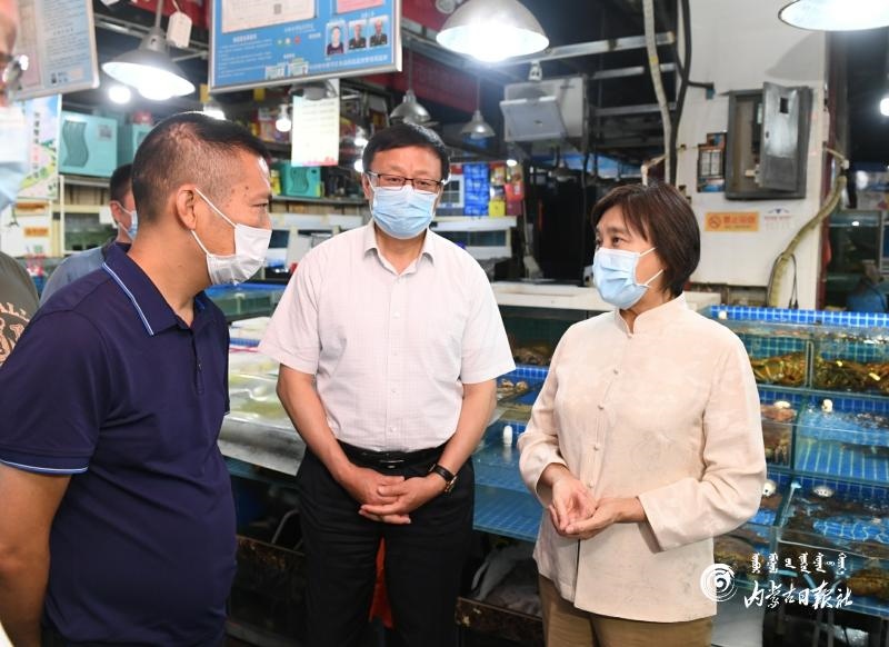 6月22日,自治區(qū)黨委副書記、自治區(qū)主席、自治區(qū)新冠肺炎疫情防控工作指揮部總指揮布小林,自治區(qū)副主席、自治區(qū)防控工作指揮部副總指揮歐陽曉暉來到位于呼和浩特市賽罕區(qū)的融橋海鮮市場(chǎng),了解海鮮和水產(chǎn)品產(chǎn)地、物流運(yùn)輸、銷量變化等情況。內(nèi)蒙古日?qǐng)?bào)社融媒體記者 韓卿立 攝