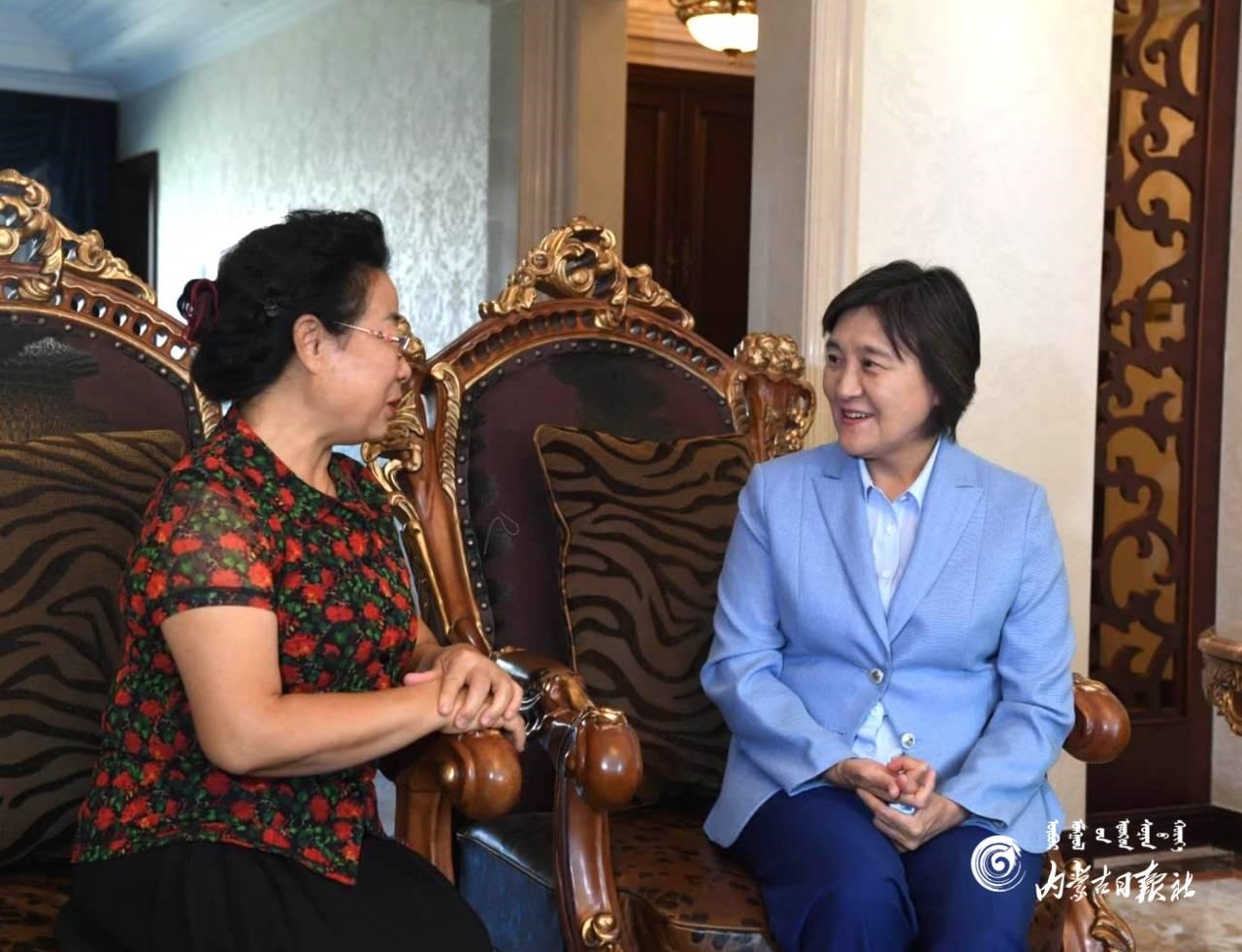 9月10日上午,自治區(qū)黨委副書記、自治區(qū)主席布小林慰問呼和浩特市第二中學退休教師姜超霞(右)。內蒙古日報社融媒體記者 韓卿立 攝