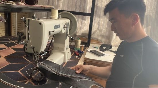 圖為阿巴嘎旗綜合實訓(xùn)基地內(nèi),一名小伙子正在制作搏克手的摔跤服。