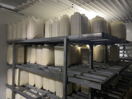 圖為照富經(jīng)貿(mào)有限責(zé)任公司的冷庫,一桶桶從牧戶家收集來的馬奶被整齊排列。