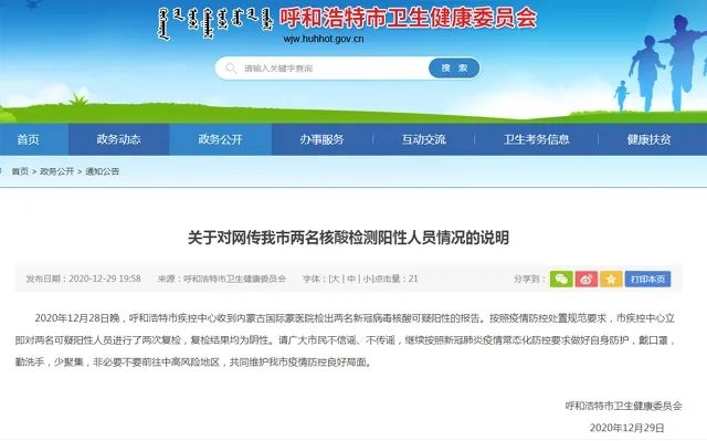 2020年12月28日晚,呼和浩特市疾控中心收到內蒙古國際蒙醫(yī)院檢出兩名新冠病毒核酸可疑陽性的報告。按照疫情防控處置規(guī)范要求,市疾控中心立即對兩名可疑陽性人員進行了兩次復檢,復檢結果均為陰性。請廣大市民不信謠、不傳謠,繼續(xù)按照新冠肺炎疫情常態(tài)化防控要求做好自身防護,戴口罩,勤洗手,少聚集,非必要不要前往中高風險地區(qū),共同維護我市疫情防控良好局面。