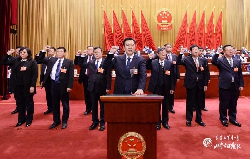 1月30日上午,內(nèi)蒙古人民會(huì)堂國(guó)徽高懸,五星紅旗鮮艷奪目,自治區(qū)十三屆人大四次會(huì)議新當(dāng)選人員憲法宣誓儀式在這里舉行。