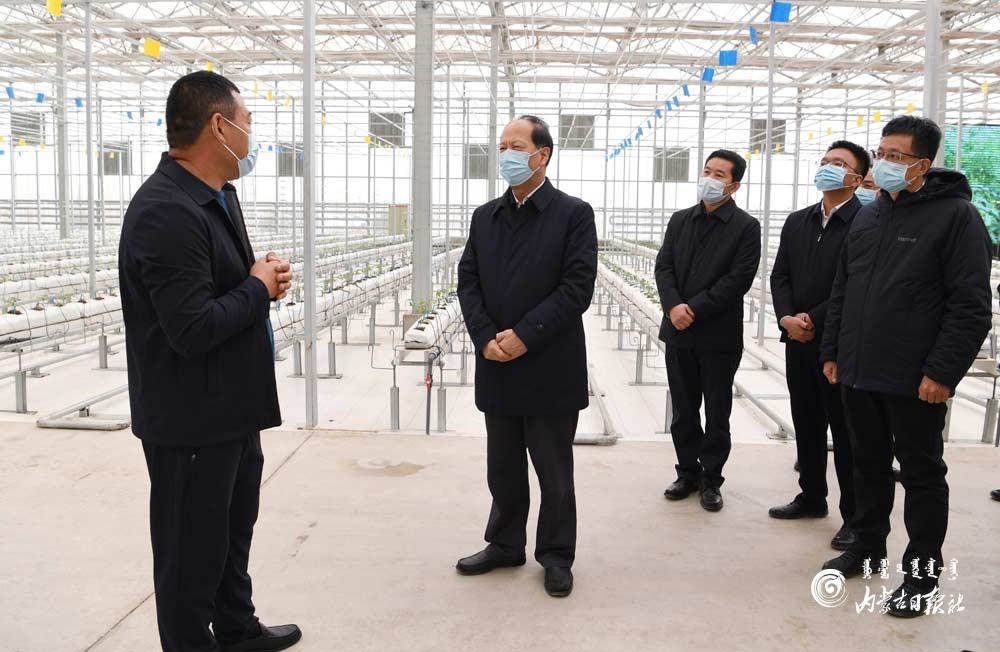 3月16日,自治區(qū)黨委書記、人大常委會(huì)主任石泰峰來到巴彥淖爾市臨河區(qū)鮮農(nóng)農(nóng)業(yè)科技園區(qū),走進(jìn)智能聯(lián)棟溫室,了解現(xiàn)代農(nóng)業(yè)運(yùn)營(yíng)情況。內(nèi)蒙古日?qǐng)?bào)社融媒體記者袁永紅攝