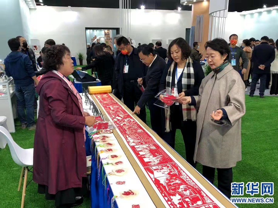參會(huì)嘉賓在傳統(tǒng)手工藝品、文創(chuàng)產(chǎn)品展覽展示區(qū)參觀。新華網(wǎng) 李國(guó)棟 攝