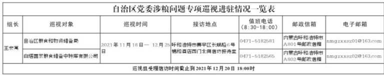 據(jù)悉,自治區(qū)黨委巡視組現(xiàn)場巡視時間為40天左右,巡視期間設(shè)立專門值班電話、郵政信箱、電子郵箱等。巡視組受理信訪時間截至2021年12月20日。根據(jù)巡視工作條例及相關(guān)規(guī)定,巡視組主要受理糧食購銷領(lǐng)域的相關(guān)問題反映,重點是黨員干部涉糧方面的違紀(jì)違法問題。其他不屬于巡視受理范圍的信訪問題,將按規(guī)定轉(zhuǎn)有關(guān)部門認(rèn)真處理。