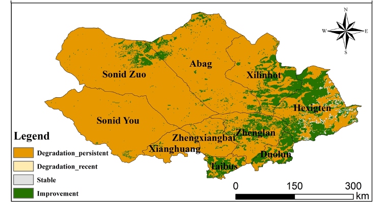 論文通訊作者王鋒研究員進(jìn)一步解釋說,該評估框架以16年為評價(jià)時(shí)段,間隔5年開展生態(tài)系統(tǒng)生態(tài)質(zhì)量評價(jià)。將2000-2015年的生態(tài)質(zhì)量作為參考基線,2005-2020年的生態(tài)質(zhì)量作為現(xiàn)狀,通過生態(tài)系統(tǒng)現(xiàn)狀質(zhì)量與參考基線質(zhì)量的比較開展評價(jià)。使用歸一化植被指數(shù)、土壤有機(jī)碳和沙塵暴三個(gè)指標(biāo)分別代表植被、土壤和大氣質(zhì)量,每個(gè)指標(biāo)變化包括提高、穩(wěn)定和退化3個(gè)水平。三個(gè)指標(biāo)通過邏輯運(yùn)算而非權(quán)重計(jì)算獲得生態(tài)系統(tǒng)質(zhì)量指標(biāo)變化,兼顧了不同響應(yīng)速率指標(biāo)變化對生態(tài)系統(tǒng)質(zhì)量的影響。若三個(gè)指標(biāo)中有一項(xiàng)退化,生態(tài)質(zhì)量指標(biāo)即為退化。