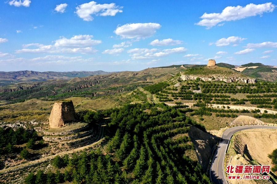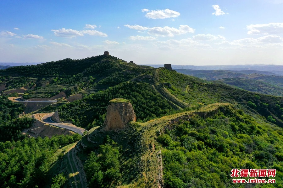 端午時節(jié),由G209國道岔口至老牛坡的公路正在緊張建設(shè)中。汽車沿著剛剛鋪好軟基的砂石路面行進(jìn),車窗外,高高低低的烽火墩臺聳立在山巒之上,巍峨雄偉,座座墩臺直沖云霄,蔚為壯觀。清水河縣明長城國家文化公園的核心區(qū)小元峁段長城(栜木塔長城)即位于此。