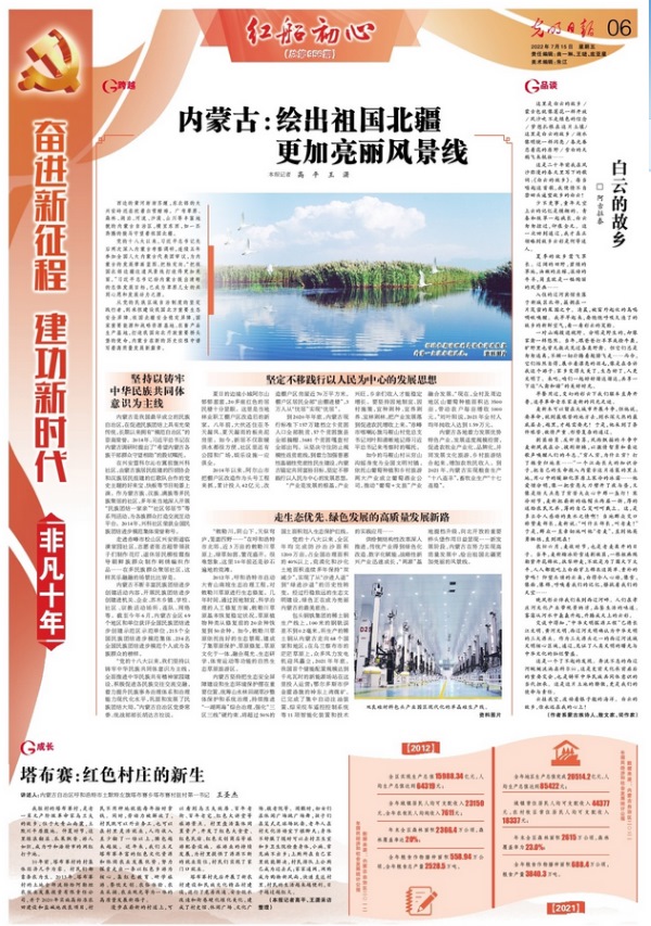 7月15日,《光明日報(bào)》6版刊發(fā)《奮進(jìn)新征程建功新時(shí)代·非凡十年|內(nèi)蒙古:繪出祖國北疆更加亮麗風(fēng)景線》,全文如下: