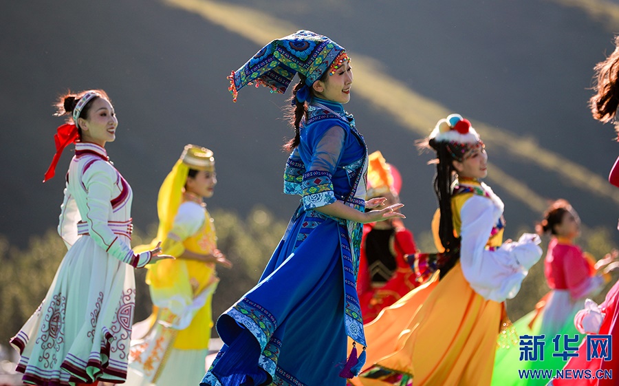 8月8日,烏蘭牧騎的隊(duì)員在開幕式上踏歌起舞。新華網(wǎng)發(fā)(丁根厚攝)