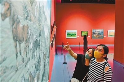 “美麗中國·內(nèi)蒙古形象”主題美術(shù)作品展聚焦“兩個打造”,119幅美術(shù)作品以全區(qū)12個盟市獨(dú)特的自然風(fēng)光、人文景觀、生態(tài)面貌為底色,描繪內(nèi)蒙古草之茂、林之郁、湖之美、水之秀、田之沃、沙之魅,全面展示了內(nèi)蒙古真善美的形象。記者 王磊 攝