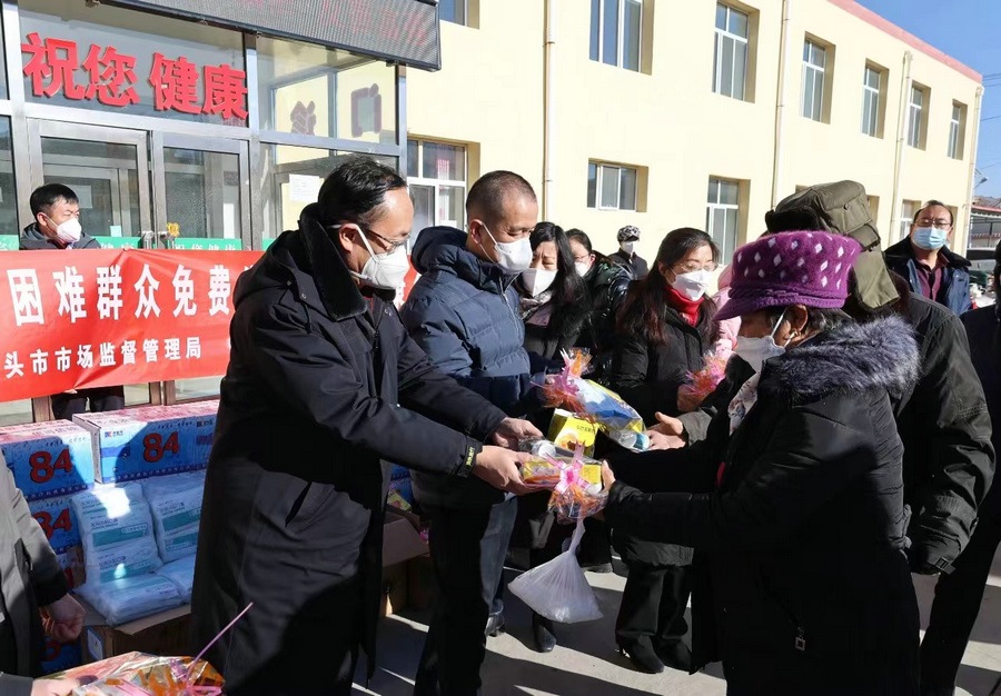 包頭市市場(chǎng)監(jiān)督管理局急困難群眾用藥之所急,解困難群眾用藥之所盼,組織10個(gè)旗縣區(qū)市場(chǎng)監(jiān)管部門發(fā)揮職能作用,協(xié)調(diào)全市各藥品經(jīng)營(yíng)企業(yè)踴躍承擔(dān)社會(huì)責(zé)任,千方百計(jì)籌措當(dāng)前防疫緊缺藥械,為全市近2萬(wàn)名農(nóng)村牧區(qū)群眾送去防疫藥械愛(ài)心包,有效地緩解了包頭市農(nóng)村牧區(qū)困難群眾購(gòu)藥遠(yuǎn)、購(gòu)藥難的實(shí)際問(wèn)題。