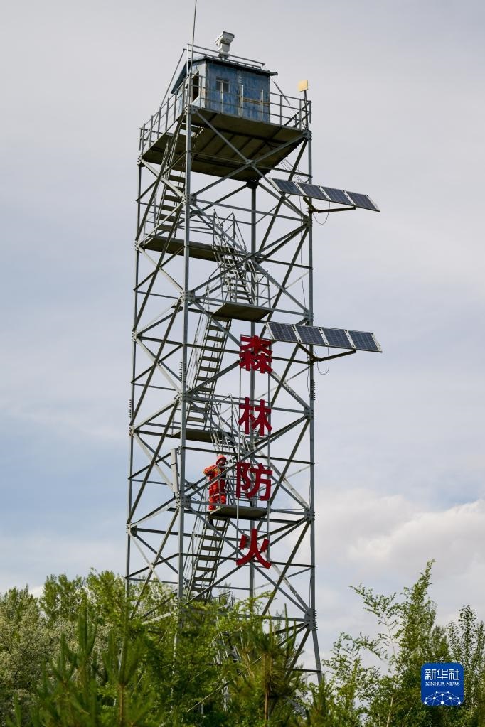 6月5日,臨河區(qū)國營新華林場護林員登上瞭望塔準(zhǔn)備開展巡護工作。新華社記者 李志鵬 攝