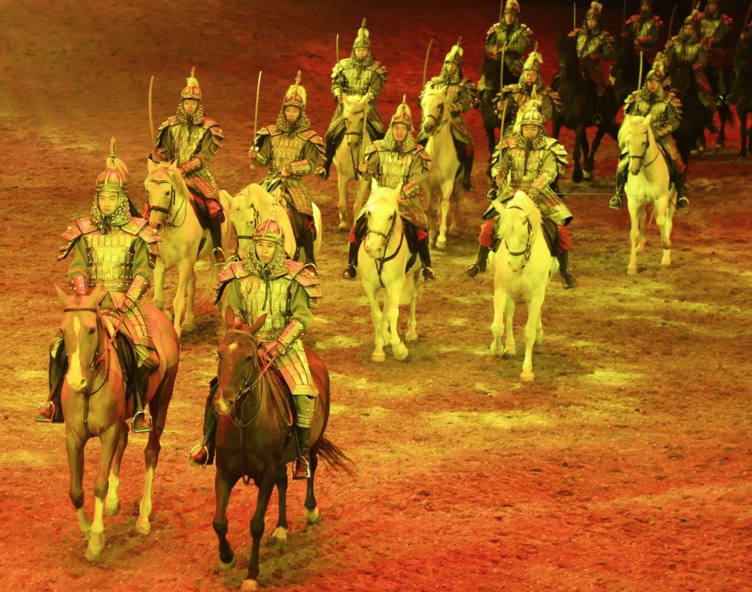 蒙古馬、汗血寶馬、盧西塔諾、弗里斯蘭、安達盧西亞、德保矮馬、阿拉伯馬等百余匹名馬、百名騎手組成龐大陣容的表演,整場演出恢宏震撼,充滿視覺沖擊力。