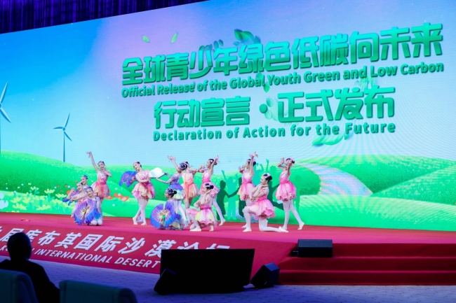 中福會(huì)少年兒童代表在論壇會(huì)議舞臺(tái)上帶來(lái)了創(chuàng)意獨(dú)特的“青少年、沙漠、未來(lái)”特別活動(dòng)。通過(guò)少兒舞蹈與數(shù)字人互動(dòng)表演的創(chuàng)新形式發(fā)布“全球綠色低碳發(fā)展青少年宣言”。