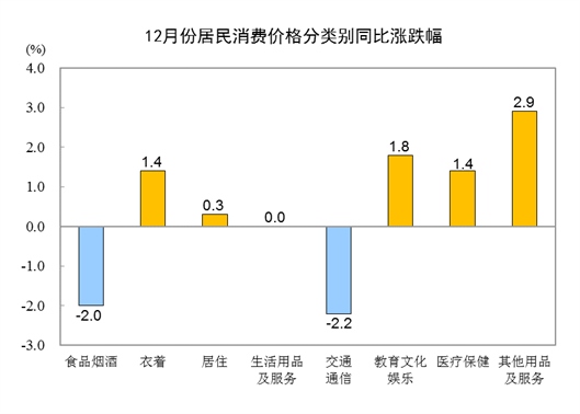 12月份,全國居民消費(fèi)價(jià)格環(huán)比上漲0.1%。其中,城市上漲0.1%,農(nóng)村上漲0.1%;食品價(jià)格上漲0.9%,非食品價(jià)格下降0.1%;消費(fèi)品價(jià)格上漲0.1%,服務(wù)價(jià)格上漲0.1%。