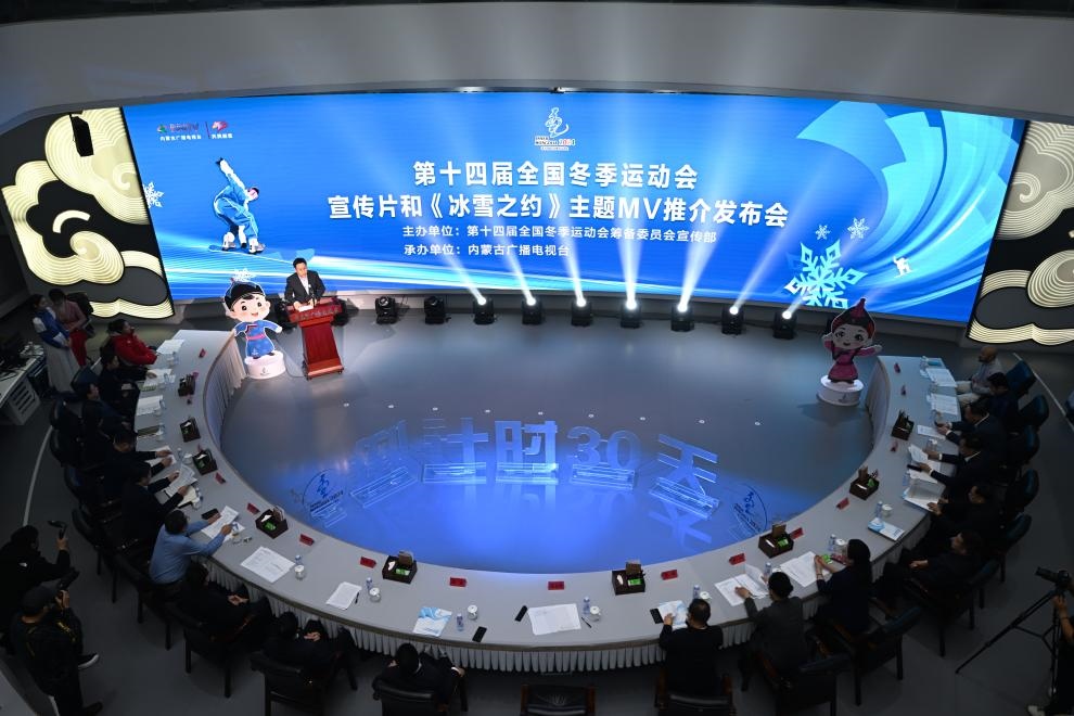 ??這是1月17日拍攝的第十四屆全國冬季運(yùn)動會宣傳片和《冰雪之約》主題MV推介發(fā)布會現(xiàn)場。新華社記者 貝赫 攝
