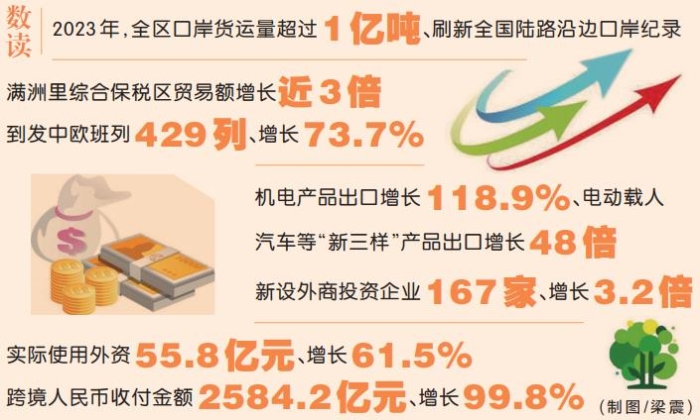 2023年,全區(qū)口岸貨運量超過1億噸、刷新全國陸路沿邊口岸紀(jì)錄;滿洲里綜合保稅區(qū)貿(mào)易額增長近3倍;到發(fā)中歐班列429列、增長73.7%;機(jī)電產(chǎn)品出口增長118.9%、電動載人汽車等“新三樣”產(chǎn)品出口增長48倍;新設(shè)外商投資企業(yè)167家、增長3.2倍;實際使用外資55.8億元、增長61.5%;跨境人民幣收付金額2584.2億元、增長99.8%……