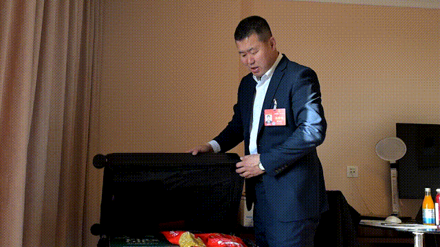 在全國人大代表、烏蘭察布市卓資縣十八臺鎮(zhèn)黃旗灘村黨支部書記、村委會主任薛志龍的行李箱里,幾只密封包裝的卓資熏雞、兩瓶不同吃法的亞麻籽油、些許袋裝的亞麻籽,占據了行李箱一多半的空間,這些獨有的美味也吸引了來自各地的全國人大代表的目光。