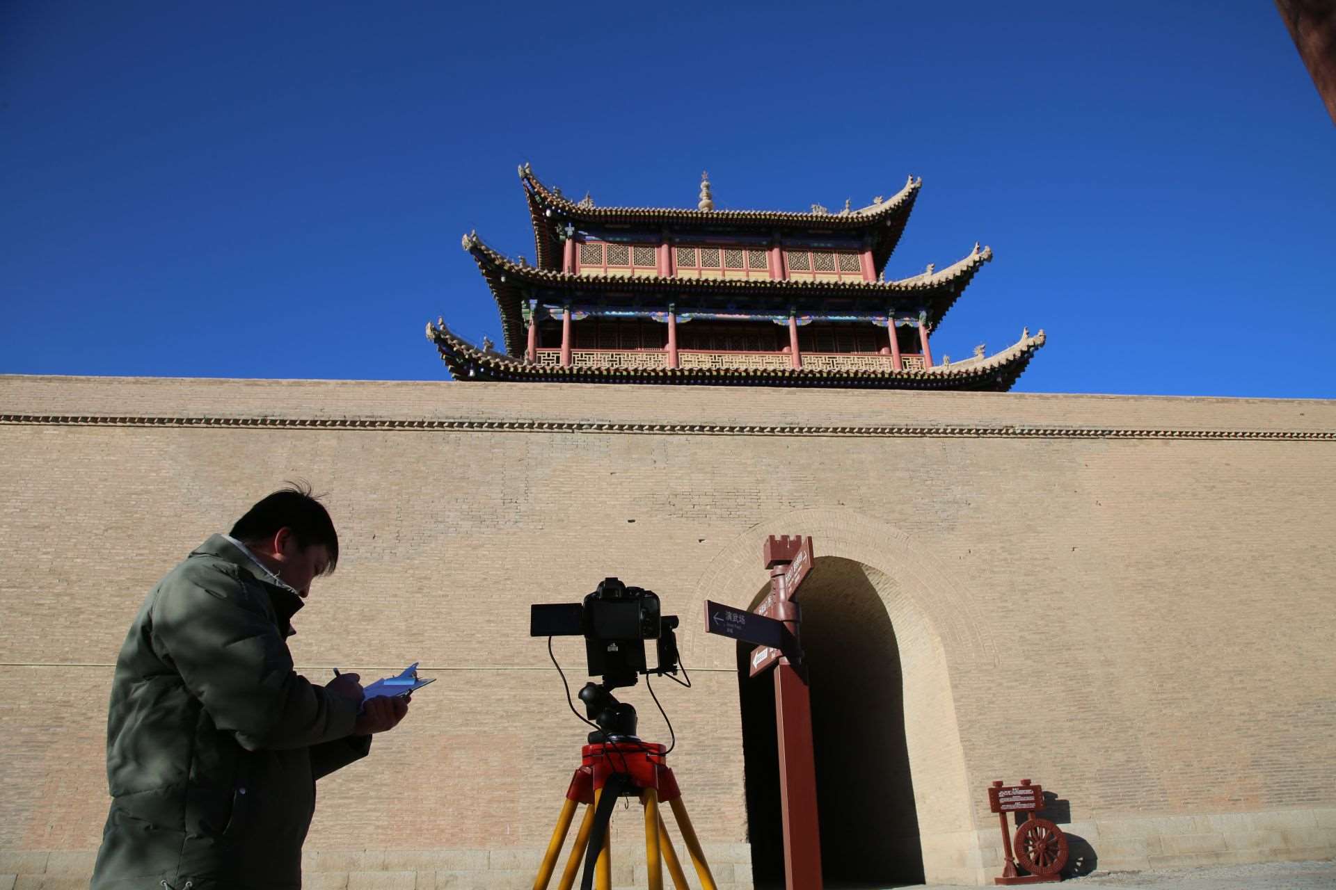 1月29日,嘉峪關(guān)絲路(長城)文化研究院文化遺產(chǎn)監(jiān)測中心工作人員高商,正在對柔遠(yuǎn)樓城臺裂縫進行定期監(jiān)測。嘉峪關(guān)絲路(長城)文化研究院供圖