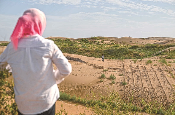 ??治沙戰(zhàn)役開展得更加轟轟烈烈,早在上世紀(jì)五六十年代,一場全民參與的防風(fēng)固沙戰(zhàn)役就在鄂爾多斯大地打響。當(dāng)?shù)匕傩諑资耆缫蝗眨坏酱禾炀烷_始設(shè)置沙障、種植樹苗,涌現(xiàn)出殷玉珍、吳向東、曹扎娃等一大批治沙勞?!,F(xiàn)在,沙漠大數(shù)據(jù)分析技術(shù)、種質(zhì)資源技術(shù)、無人機(jī)飛播技術(shù)等現(xiàn)代治沙科技大大提高了生態(tài)治理水平,更進(jìn)一步賦能綠色發(fā)展。