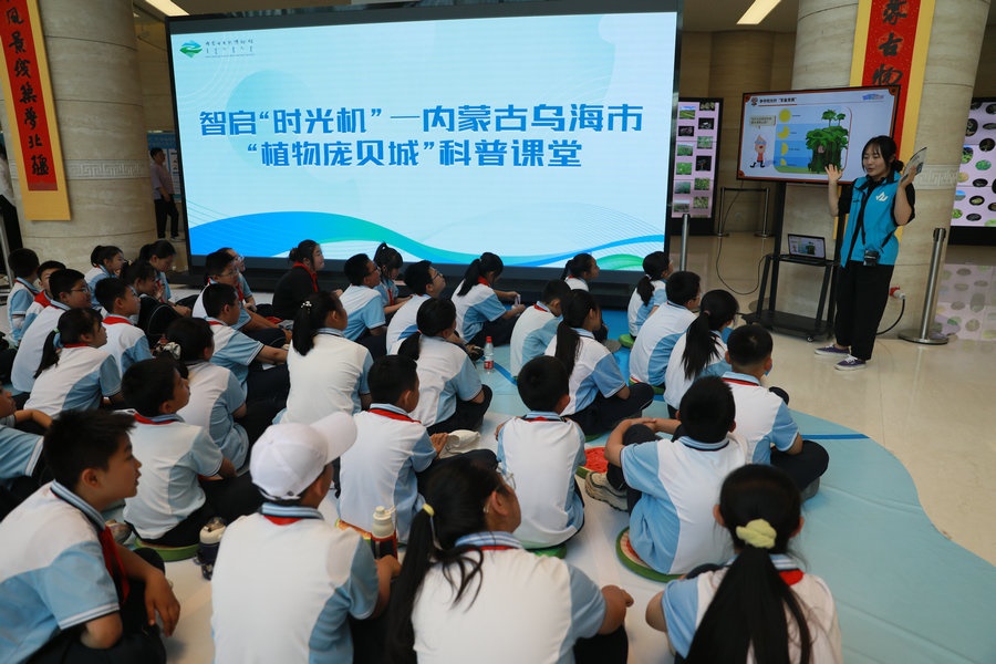 公益科普活動中,邀請大學路小學的學生參與以內蒙古烏海市“植物龐貝城”前沿科研成果為依托開發(fā)的智啟“時光機”科普課程;開展化石形成的動手體驗活動,在做中教,在做中學,以“勞”啟智,“動”促成長;進行“自然+環(huán)保+藝術”環(huán)保服裝創(chuàng)新設計靜態(tài)展示,同公眾一起解讀設計師的服飾設計“密碼”;聆聽“小小講解員”的科普聲,在對壯美內蒙古的講解中,植種初心,讓德育“自然”花開。