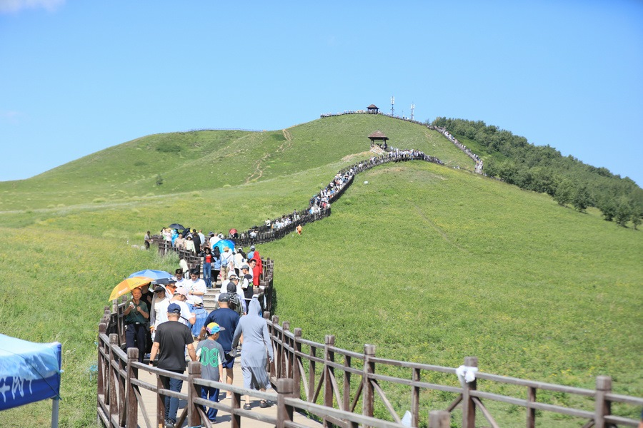 8月2日,游客在烏蘭布統(tǒng)草原打卡