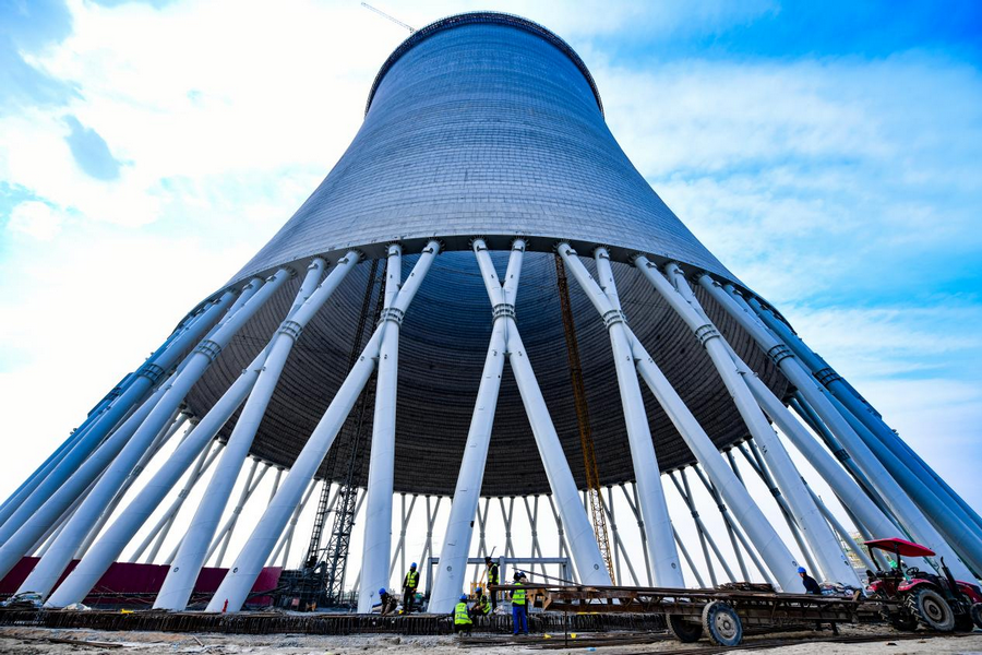 12月6日,在內(nèi)蒙古呼和浩特市土默特左旗內(nèi)蒙古能源集團金山熱電三期項目建設現(xiàn)場,工人們正有序進行著設備安裝等工作。進入該項目間冷塔內(nèi)部,抬頭仰望,仿佛一只巨大的眼睛凝視,未來該項目投產(chǎn)后可實現(xiàn)年發(fā)電量100億千瓦時,新增供熱面積5000萬平方米,將溫暖送至千家萬戶。(楊鑫 攝)