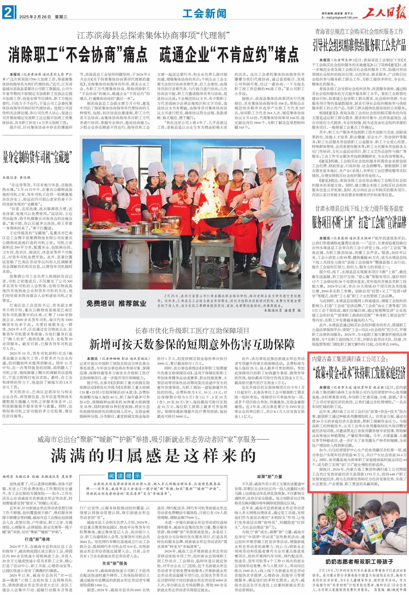 2025年2月26日,《工人日報》第2版刊發(fā)題為《內(nèi)蒙古森工集團滿歸森工公司工會:“政策+資金+技術”扶持職工發(fā)展家庭經(jīng)濟》的消息,介紹了近年來,內(nèi)蒙古森工集團滿歸森工公司工會打出“政策+資金+技術”組合拳,鼓勵職工通過種植食用菌增加收入。