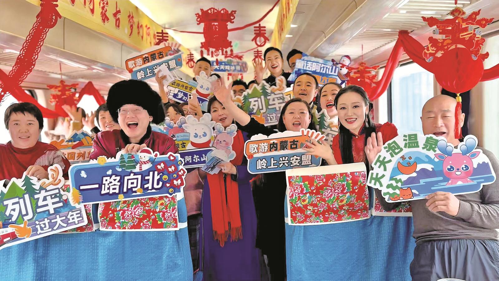 一張張貼在車(chē)窗上的“非遺”窗花剪紙,一條條紅黃藍(lán)大花座椅枕巾,一節(jié)節(jié)以藍(lán)天白云為底色的車(chē)廂頂棚,一首首悅耳的草原歌曲和悠揚(yáng)的馬頭琴聲……這個(gè)冬季,一列列由內(nèi)蒙古興安盟烏蘭浩特往返于阿爾山百年老車(chē)站的“歌游內(nèi)蒙古 夢(mèng)幻阿爾山”冰雪主題列車(chē)成為人們爭(zhēng)相體驗(yàn)的旅游產(chǎn)品。
