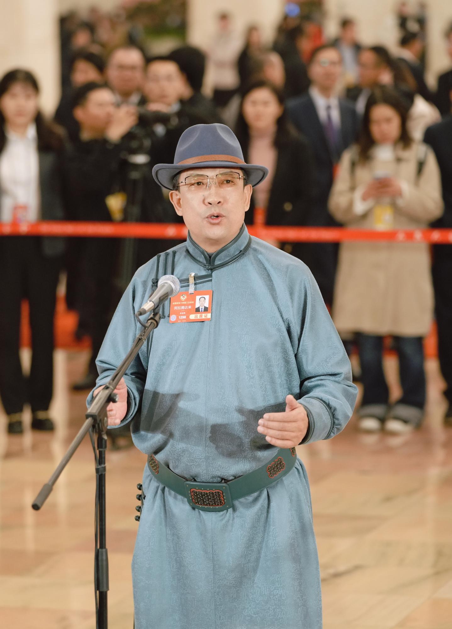 “大家好,我是全國政協(xié)委員、內(nèi)蒙古自治區(qū)錫林郭勒盟蘇尼特左旗烏蘭牧騎隊(duì)長阿拉騰達(dá)來?!?時(shí)15分許,住內(nèi)蒙古全國政協(xié)委員阿拉騰達(dá)來身著蒙古族服飾,走上“委員通道”,從容自信地向在場媒體記者作自我介紹。