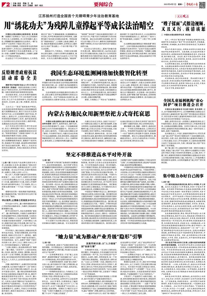 2025年4月7日,《中國婦女報》第2版刊發(fā)題為《內(nèi)蒙古各地民眾用新型祭祀方式寄托哀思》的稿件,報道了今年清明節(jié)前后,內(nèi)蒙古自治區(qū)各地不少民眾選擇網(wǎng)絡(luò)、詩詞、鮮花祭祀,家庭追思等新型祭祀方式,寄托對親人、烈士、先輩的思念,移風(fēng)易俗,文明新風(fēng)吹拂北疆大地。