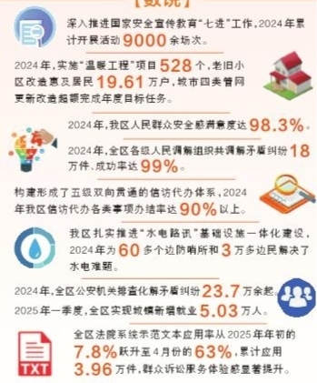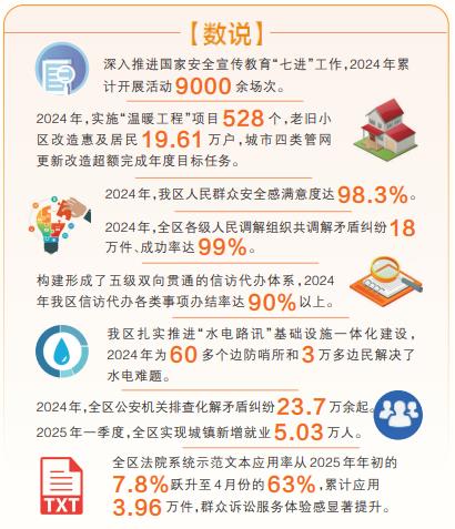 2024年,全區(qū)各級人民調解組織共調解矛盾糾紛18萬件、成功率達99%。全區(qū)信訪代辦各類事項辦結率達90%以上,一大批群眾急難愁盼事項得到及時就地解決。