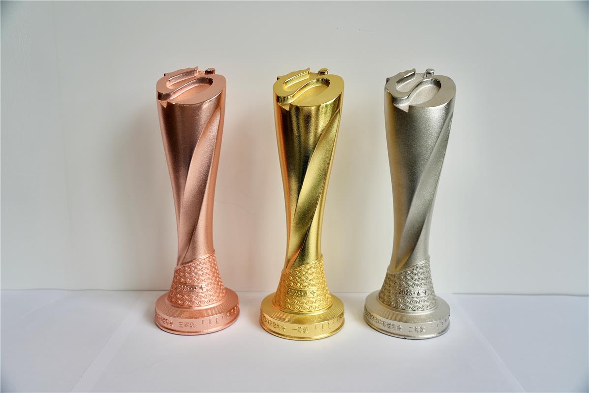 獎(jiǎng)杯頂部為會(huì)徽“奮進(jìn)”,以?xún)A斜45度的方式呈現(xiàn);外形采用扭轉(zhuǎn)升騰樣式設(shè)計(jì),體現(xiàn)了各民族運(yùn)動(dòng)員在少數(shù)民族傳統(tǒng)體育運(yùn)動(dòng)會(huì)賽場(chǎng)上英勇矯健的身姿和拼搏向上的精神。底部為紅山文化彩陶雙旋紋環(huán)繞四周,并鐫刻“2025·赤峰”,既展現(xiàn)中華優(yōu)秀傳統(tǒng)文化,又明確了本屆運(yùn)動(dòng)會(huì)舉辦地區(qū)及時(shí)間,激勵(lì)各民族運(yùn)動(dòng)員以參加本屆全區(qū)少數(shù)民族傳統(tǒng)體育運(yùn)動(dòng)會(huì)為榮耀,傳承和弘揚(yáng)民族傳統(tǒng)體育文化,構(gòu)筑中華民族共有精神家園,鑄牢中華民族共同體意識(shí)。獎(jiǎng)杯整體開(kāi)模澆鑄,鋅合金制作,表面電鍍金、銀、銅顏色。(記者 肖璐)