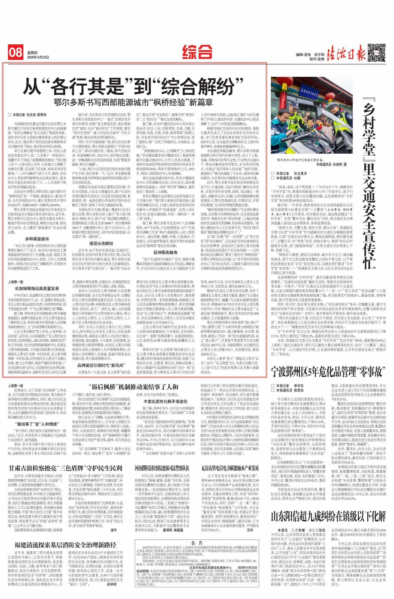 2025年10月23日,《法治日報》第8版刊發(fā)題為《從“各行其是”到“綜合解紛”鄂爾多斯書寫西部能源城市“楓橋經(jīng)驗”新篇章》的文章,報道了鄂爾多斯市以綜治中心規(guī)范化建設(shè)為核心,深入踐行新時代“楓橋經(jīng)驗”,通過多元舉措化解矛盾糾紛,全力打造“暖城善治”社會治理品牌。截至9月底,全市各級綜治中心累計受理各類矛盾糾紛22371件,化解率達96.03%。