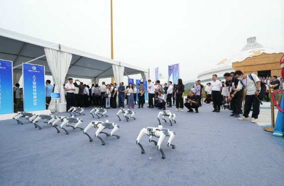 7月12日,2025綠色算力大會在呼和浩特開幕,圖為工作人員通過鍵盤操控機(jī)器狗進(jìn)行表演。