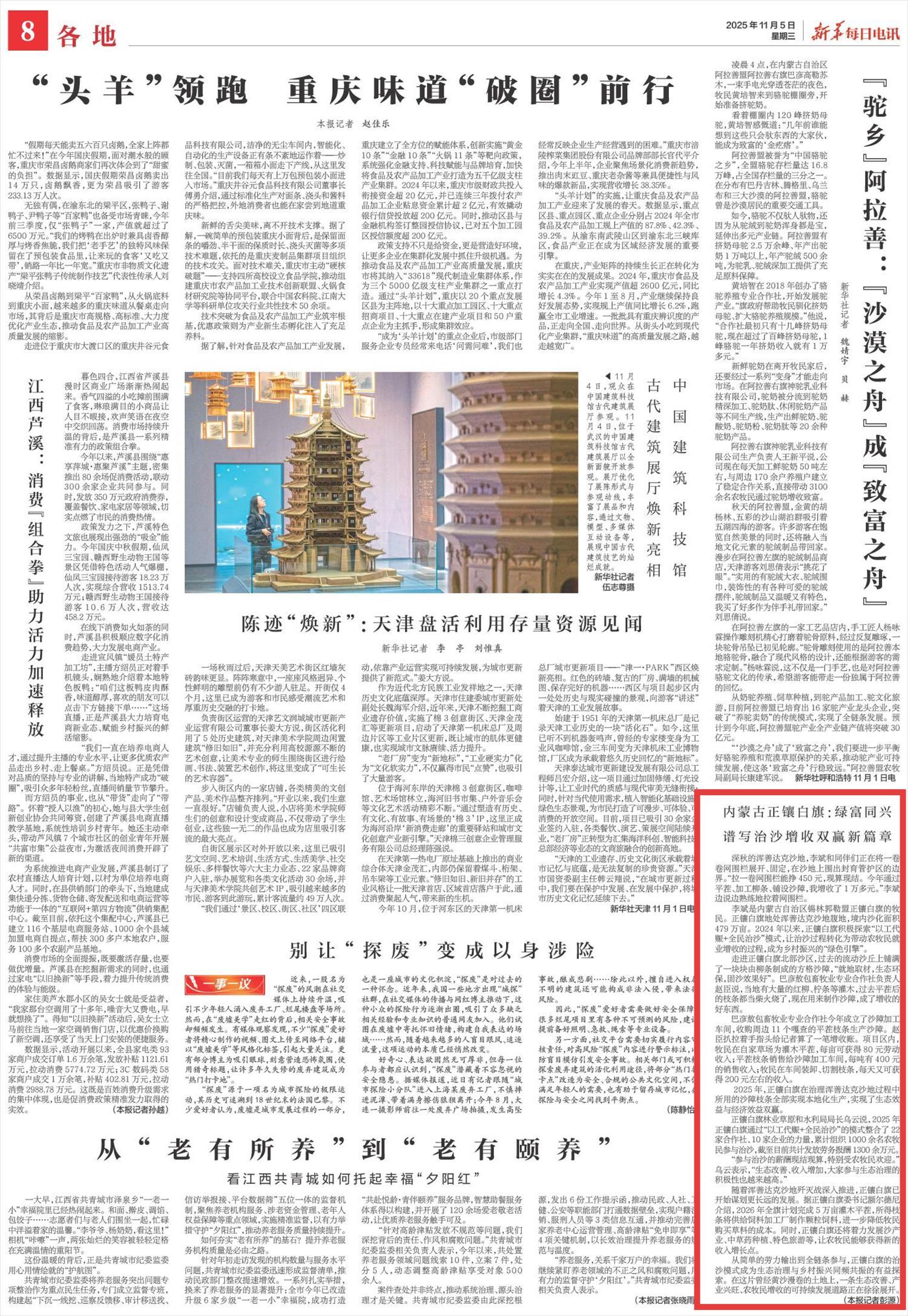 2025年11月5日,《新華每日電訊》第8版刊發(fā)題為《內(nèi)蒙古正鑲白旗:綠富同興譜寫治沙增收雙贏新篇章》的文章,報(bào)道了2024年以來,內(nèi)蒙古正鑲白旗積極探索“以工代賑+全民治沙”模式,讓治沙過程轉(zhuǎn)化為帶動農(nóng)牧民就業(yè)增收的過程,成為鄉(xiāng)村振興的“綠色引擎”。