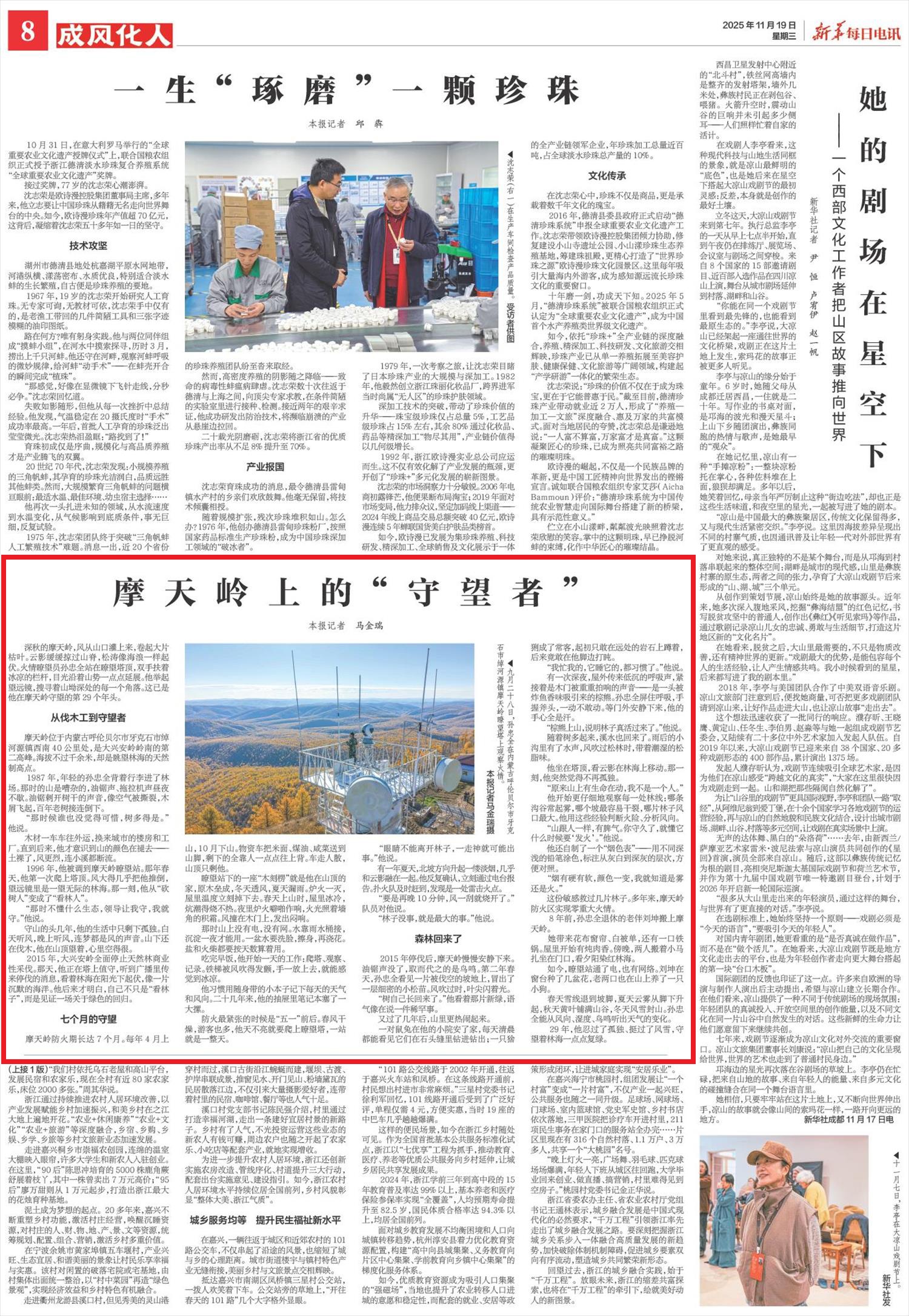 2025年11月19日,《新華每日電訊》第8版刊發(fā)題為《摩天嶺上的“守望者”》的文章,報(bào)道了摩天嶺位于內(nèi)蒙古呼倫貝爾市牙克石市綽河源鎮(zhèn)西南40公里處,是大興安嶺嶺南的第二高峰?;鹎椴t望員孫忠全站在瞭望塔頂,雙手扶著冰涼的欄桿,目光沿著山勢一點(diǎn)點(diǎn)延展。他舉起望遠(yuǎn)鏡,搜尋著山坳深處的每一個(gè)角落。這已是他在摩天嶺守望的第29個(gè)年頭。