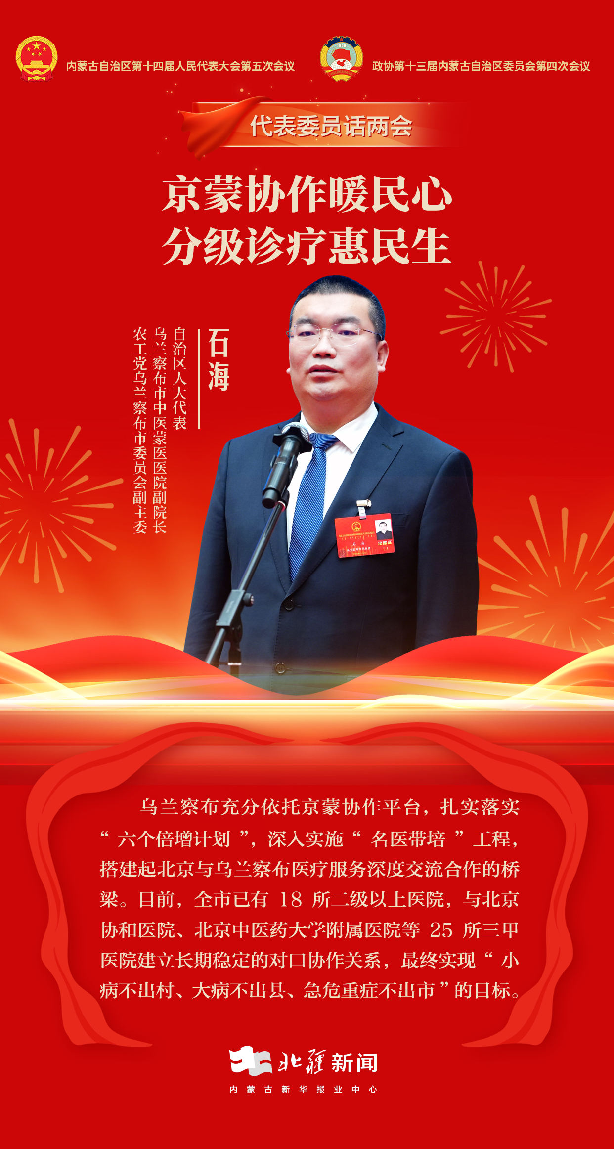 北疆新聞呼和浩特2月5日消息(記者 楊凈毓 李文華 張?chǎng)? “‘病有良醫(yī)’是人民群眾的熱切期盼,而京蒙協(xié)作正是我們破解群眾看病就醫(yī)急難愁盼、提升醫(yī)療服務(wù)水平的關(guān)鍵抓手?!?月4日,內(nèi)蒙古自治區(qū)第十四屆人民代表大會(huì)第五次會(huì)議“代表通道”上,自治區(qū)人大代表、烏蘭察布市中醫(yī)蒙醫(yī)醫(yī)院副院長(zhǎng)、農(nóng)工黨烏蘭察布市委員會(huì)副主委石海,暢談對(duì)京蒙協(xié)作引入優(yōu)質(zhì)醫(yī)療資源、推動(dòng)分級(jí)診療發(fā)展的看法與實(shí)踐。