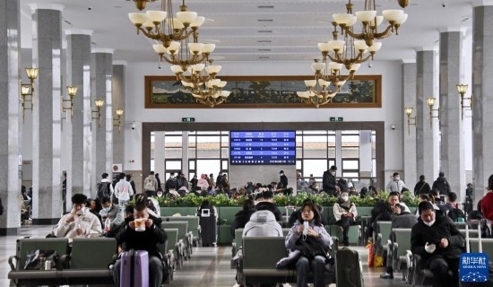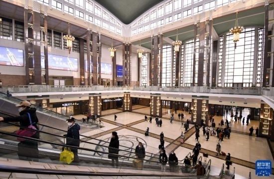 北京火車站在保持歷史原貌的前提下對候車大廳的裝飾、燈光等進行了升級改造(2023年2月17日攝)。