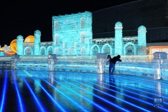 2月25日,游客在哈爾濱冰雪大世界園區(qū)拍照。