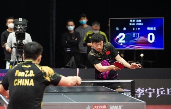 2月23日,中國乒乓球隊德班世乒賽選拔賽男單決賽中,馬龍(右)戰(zhàn)勝樊振東奪冠。新華社記者 陳鐘昊 攝