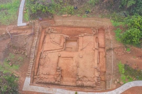 這是2月9日在重慶合川釣魚城遺址拍攝的新發(fā)掘出的類似闕臺(tái)建筑的基址(無(wú)人機(jī)照片)。新華社記者 黃偉 攝