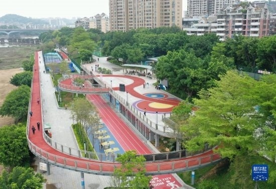 4月24日拍攝的福州市鼓樓區(qū)西河智慧體育公園內智慧跑道、智慧健身器材及健身驛站等(無人機照片)。