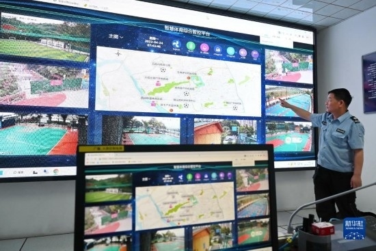 4月24日,西河智慧體育公園工作人員在介紹智慧體育綜合管控平臺。該平臺可對公園內的人流、安全、環(huán)境以及公園周邊“15分鐘健身圈”運動場地的門禁、燈光等設備實現(xiàn)智能化管理。