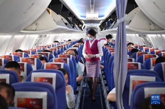 5月13日,在西安-烏魯木齊-阿什哈巴德首趟航班上,乘務(wù)員在起飛前進(jìn)行客艙安全檢查。新華社記者 邵瑞 攝
